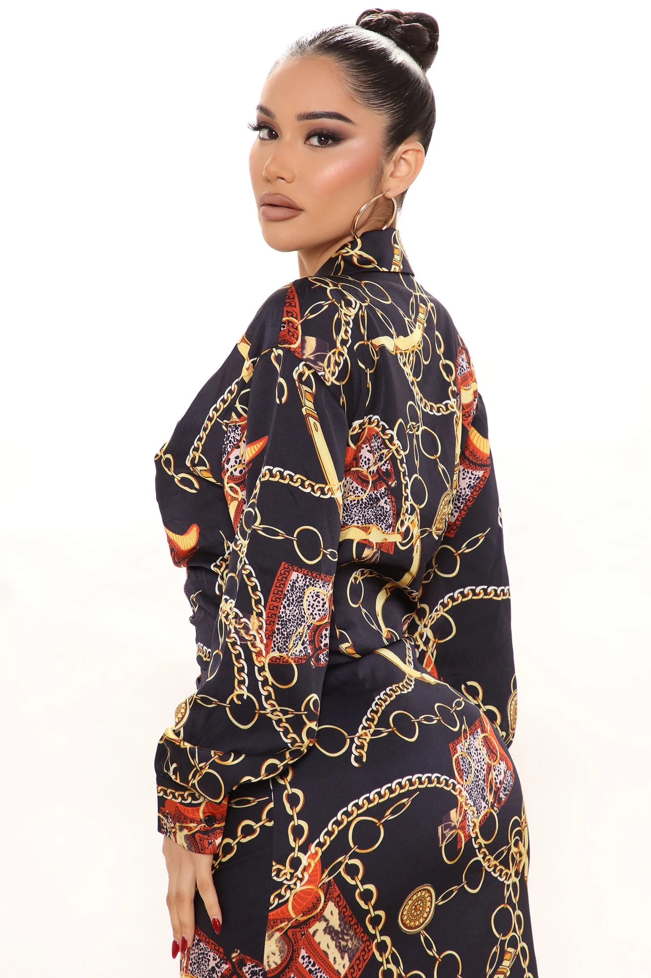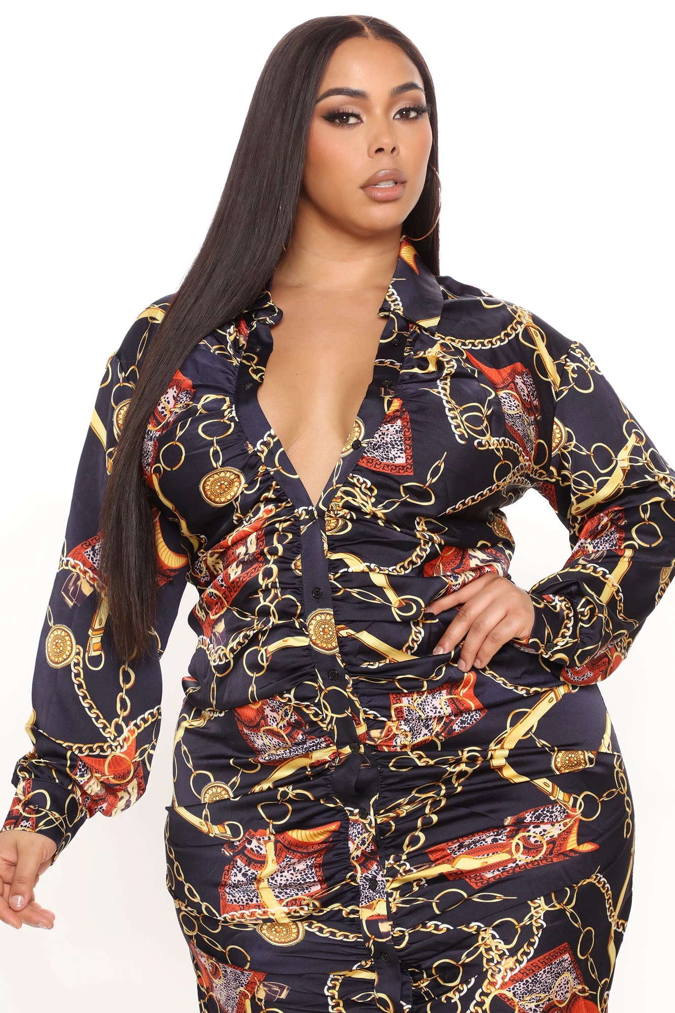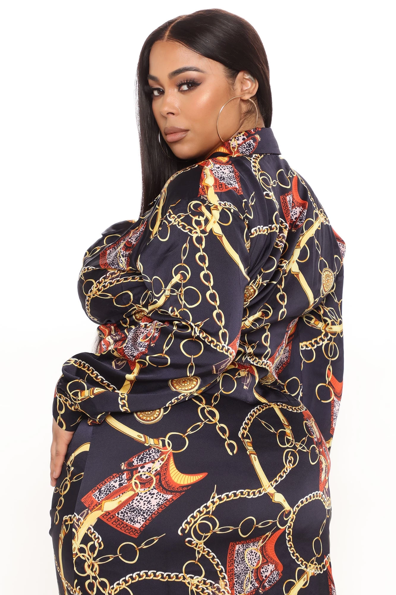 Fashion Nova Becoming Rich Satin Shirt Dress – Navy/combo