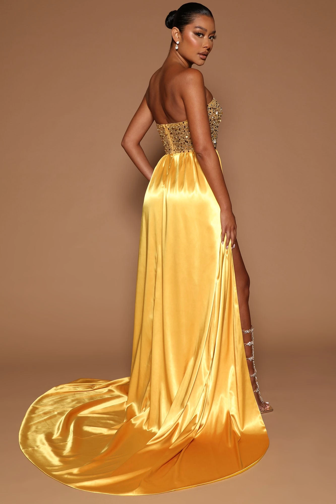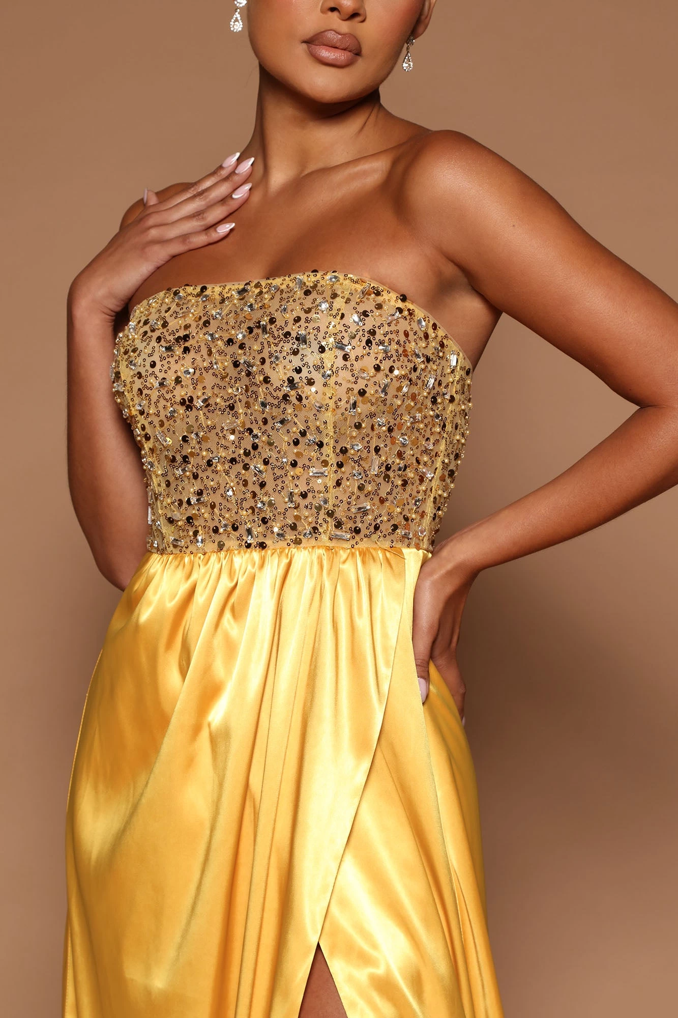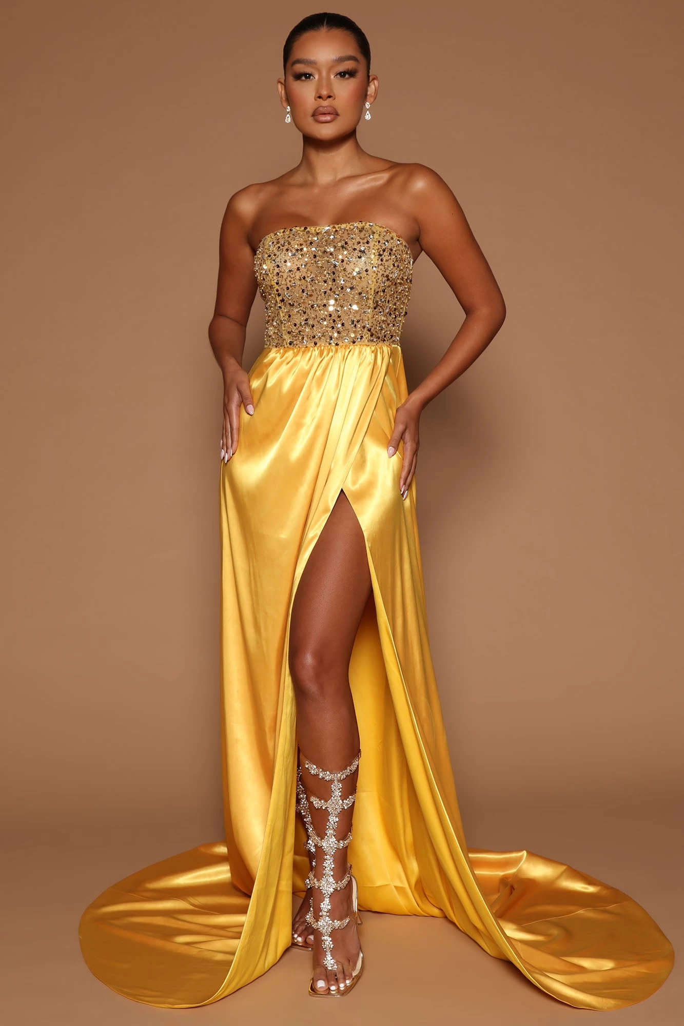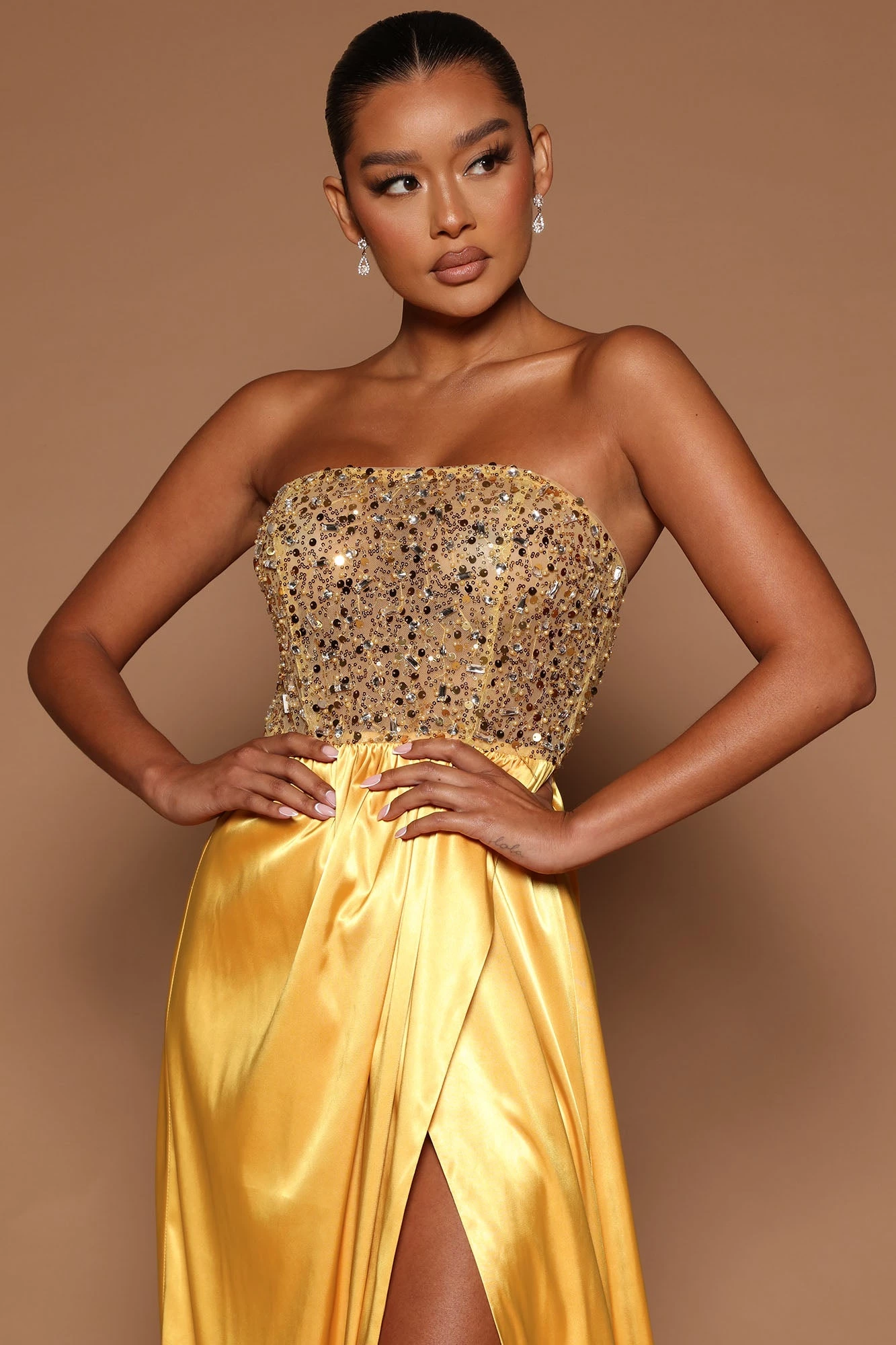 SKU: 6536836219004 Category: Maxi Dresses Tags: All Promo, atticket, color:Gold, ColorFam-Yellow, detail:High Slit, Dresses, length:Maxi, Long, Luxe