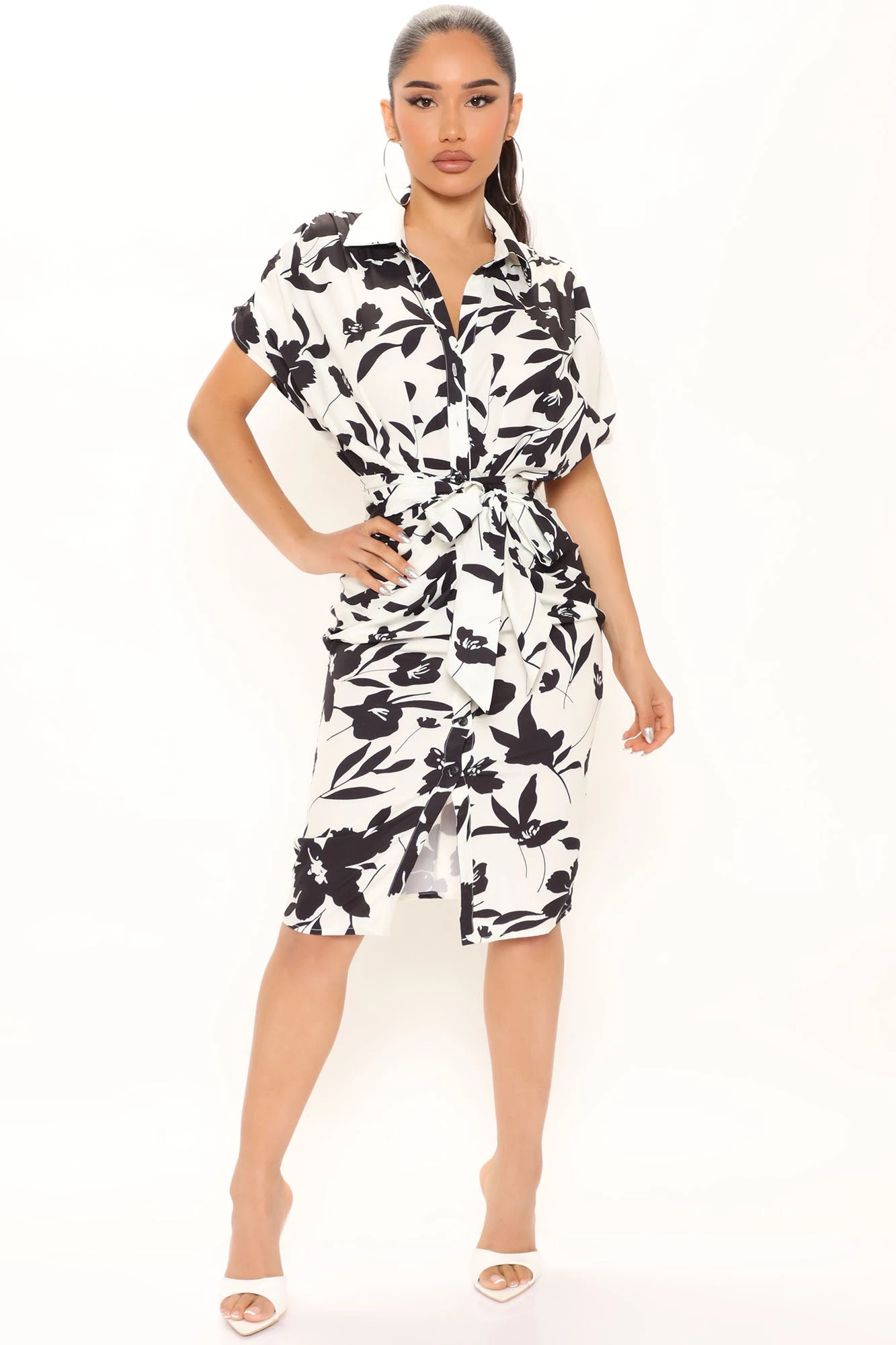 Fashion Nova Floral Emotions Shirt Dress – White/Black