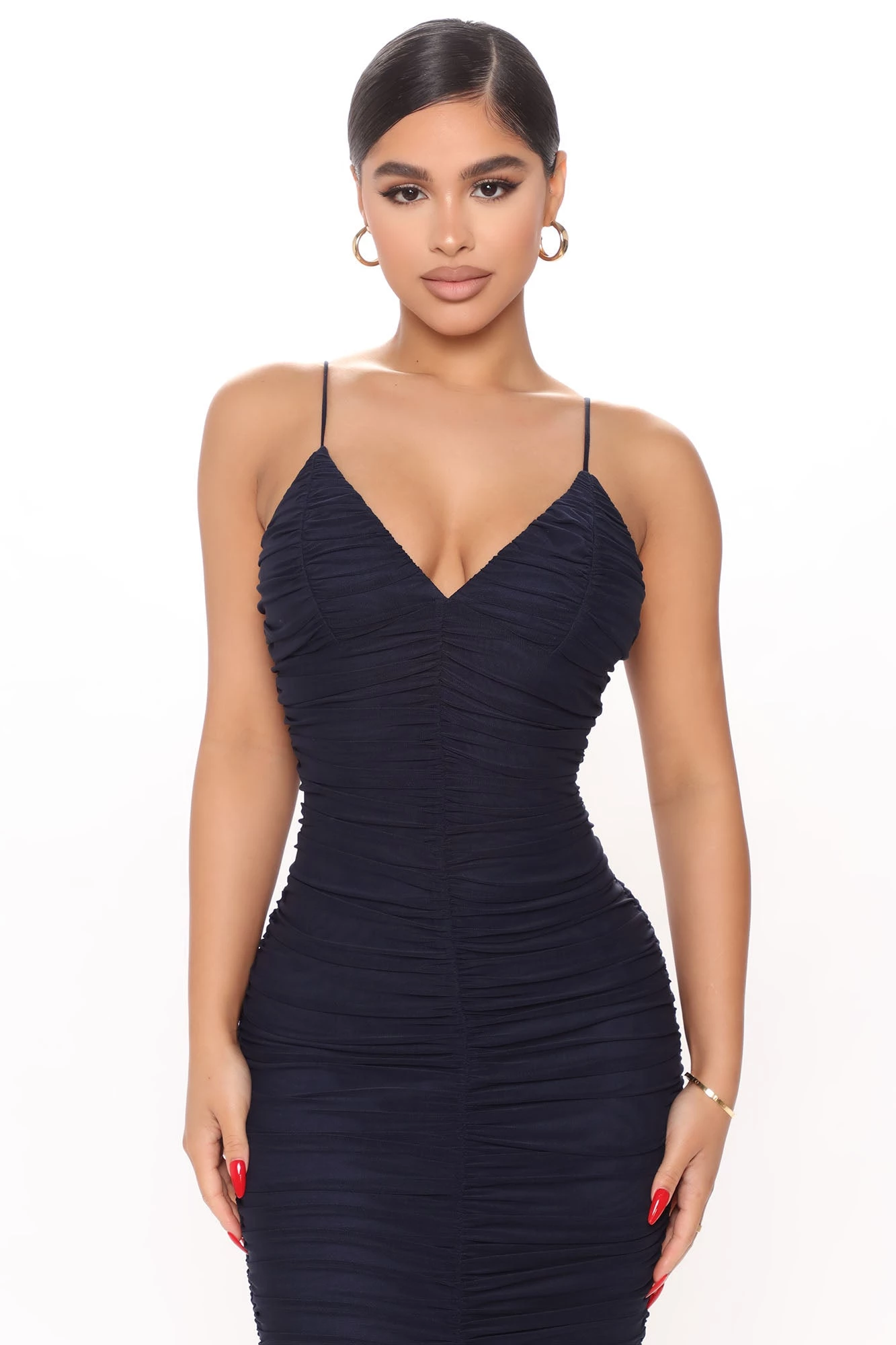 Fashion Nova From The Start Ruched Midi Dress – Navy