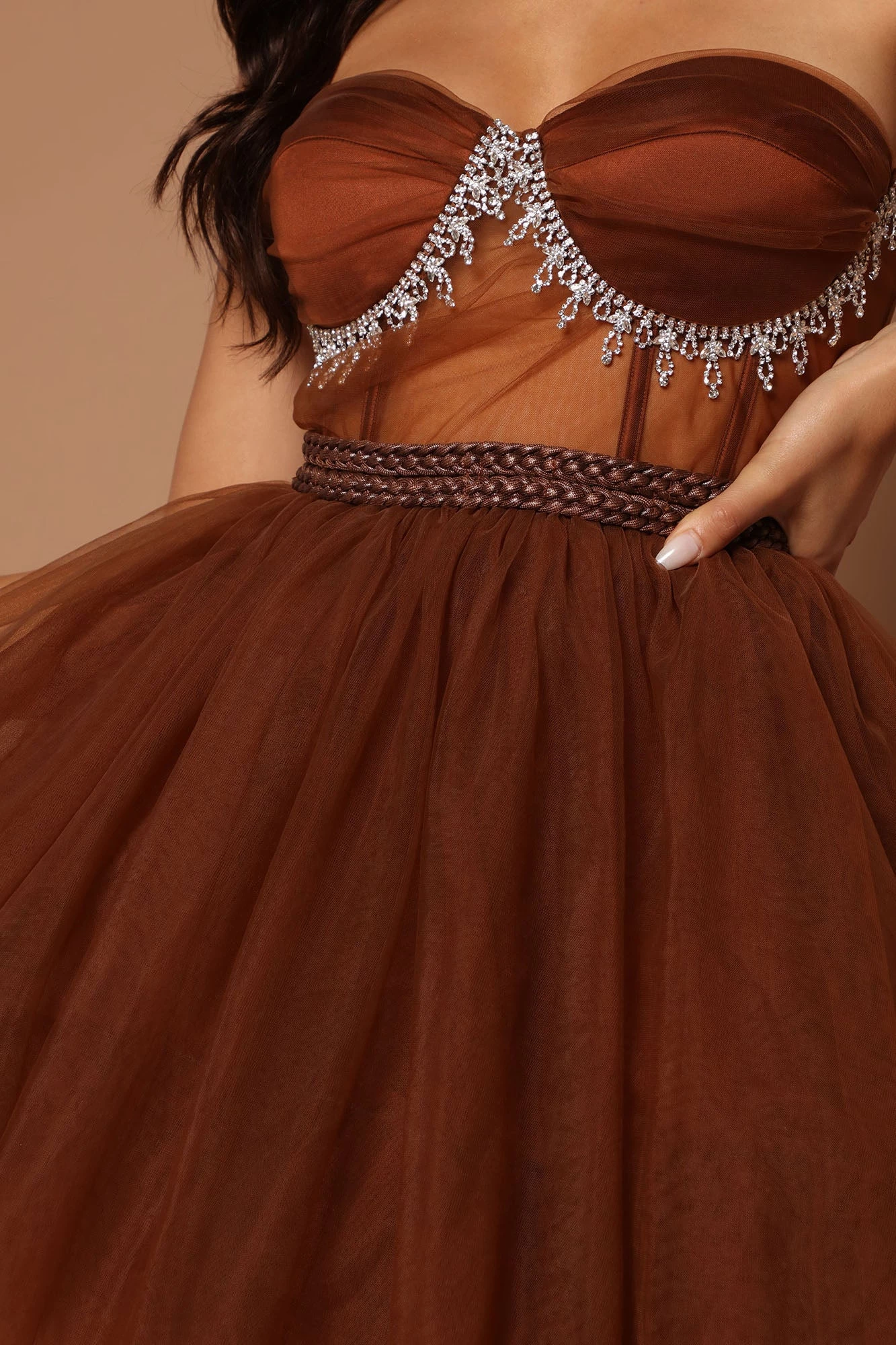 Fashion Nova Kate Embellished High Low Tulle Dress – Chocolate