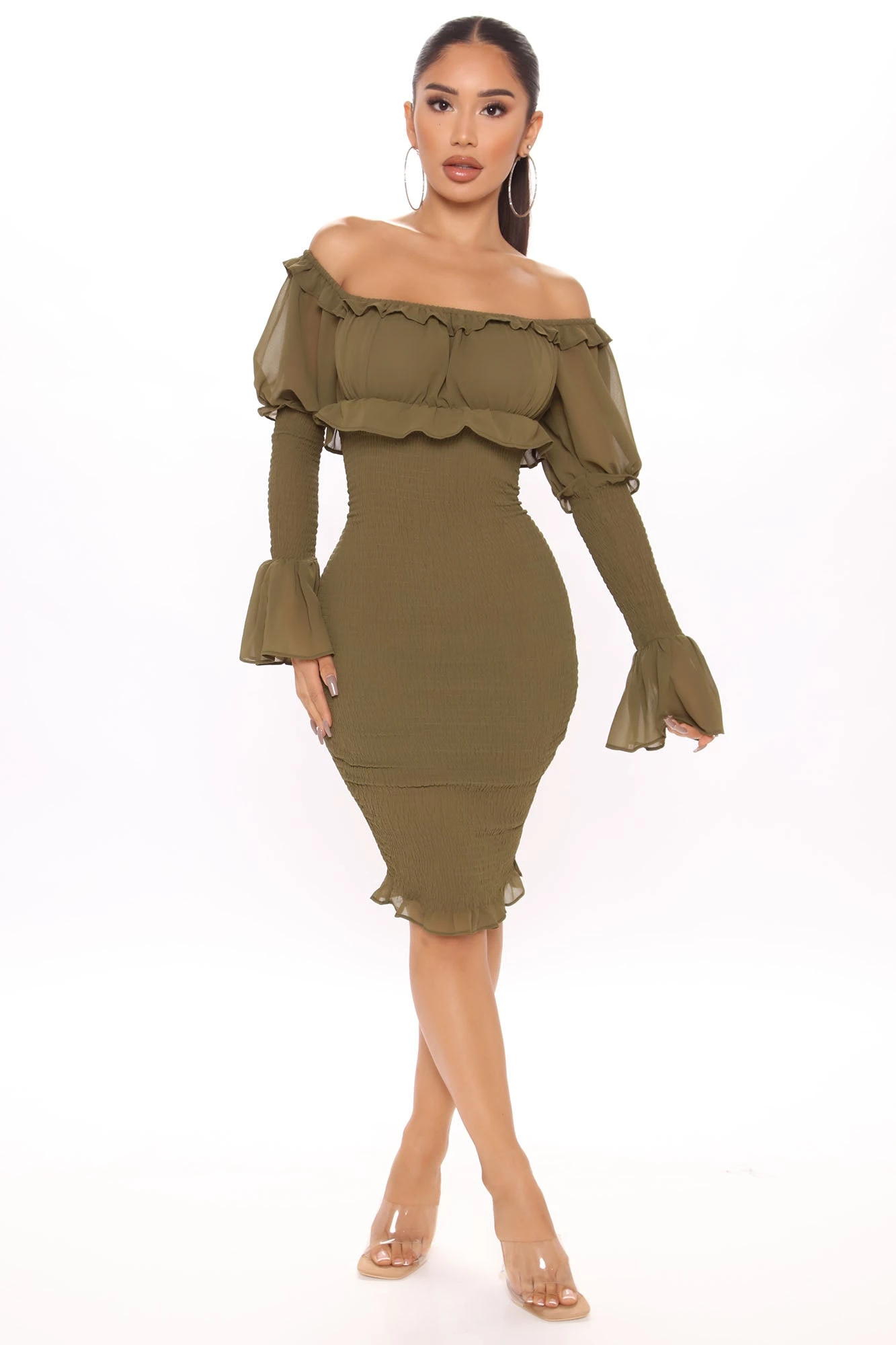 Fashion Nova Kiss Me Smocked Midi Dress – Olive