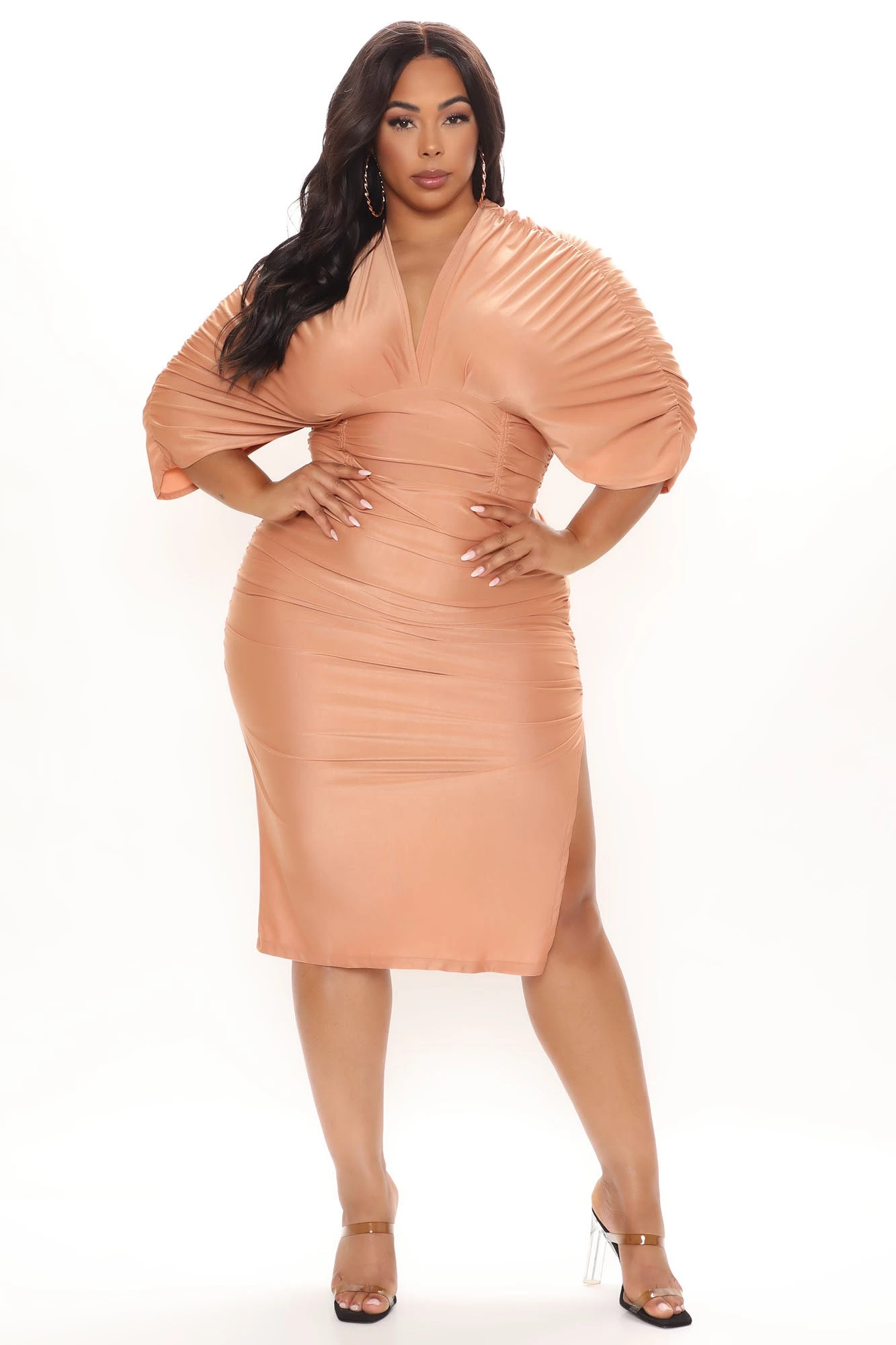 SKU: 1322832953468 Category: Midi Dresses Tags: All Promo, Club, color:Peach, ColorFam-Orange, detail:Ruched, Dresses, fallbogo, figure:Plus, graduation