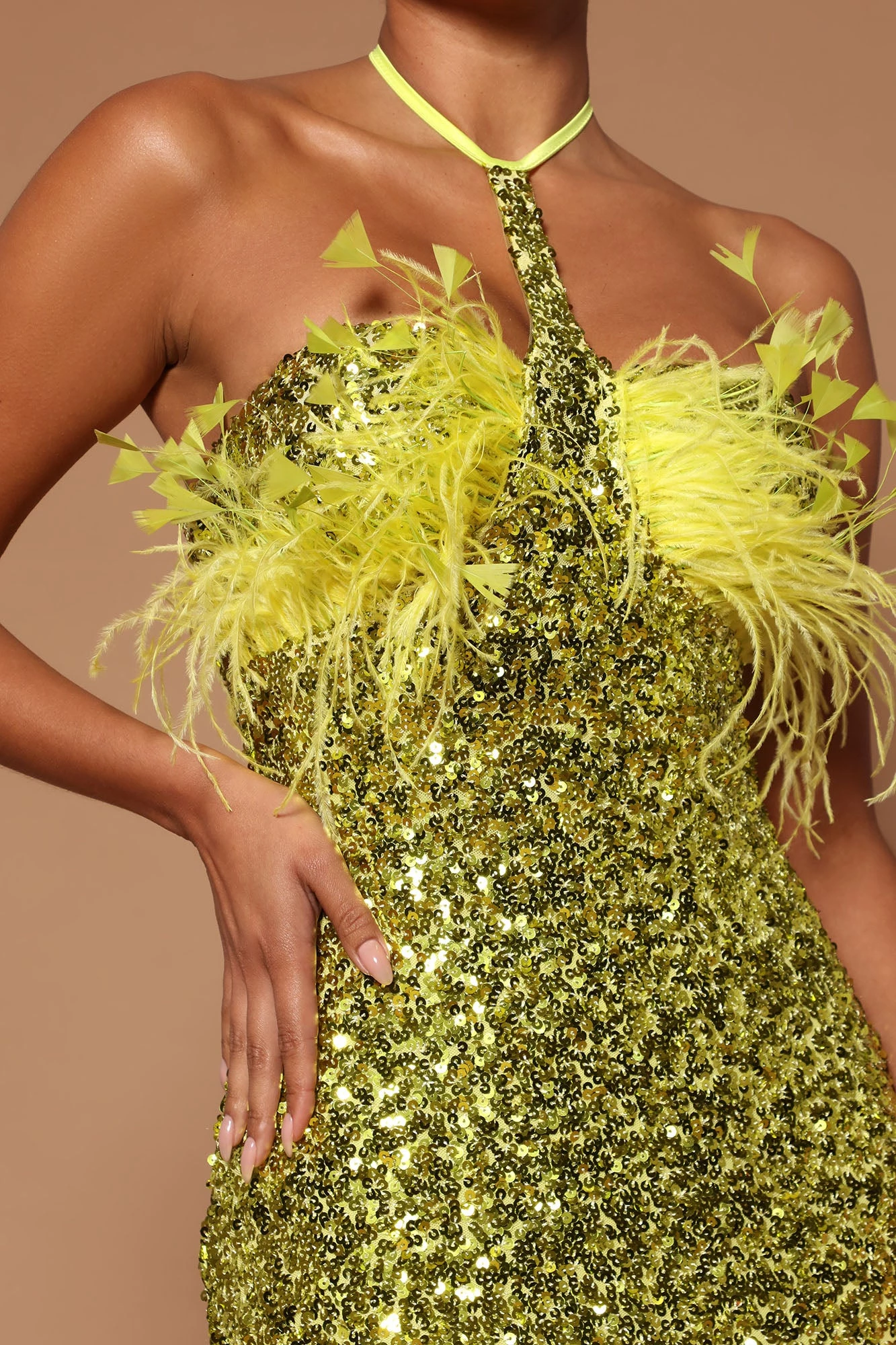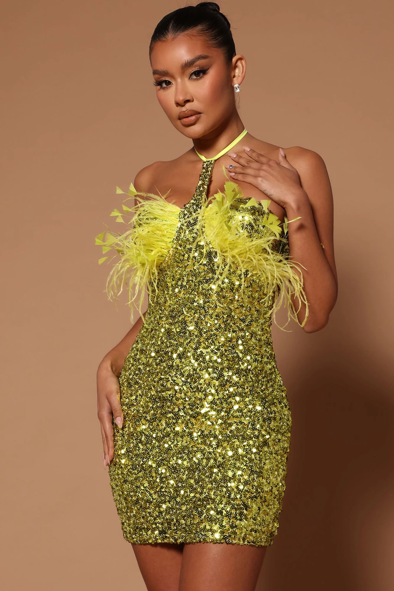 Fashion Nova Rylie Sequin Feather Halter Mini Dress – Chartreuse