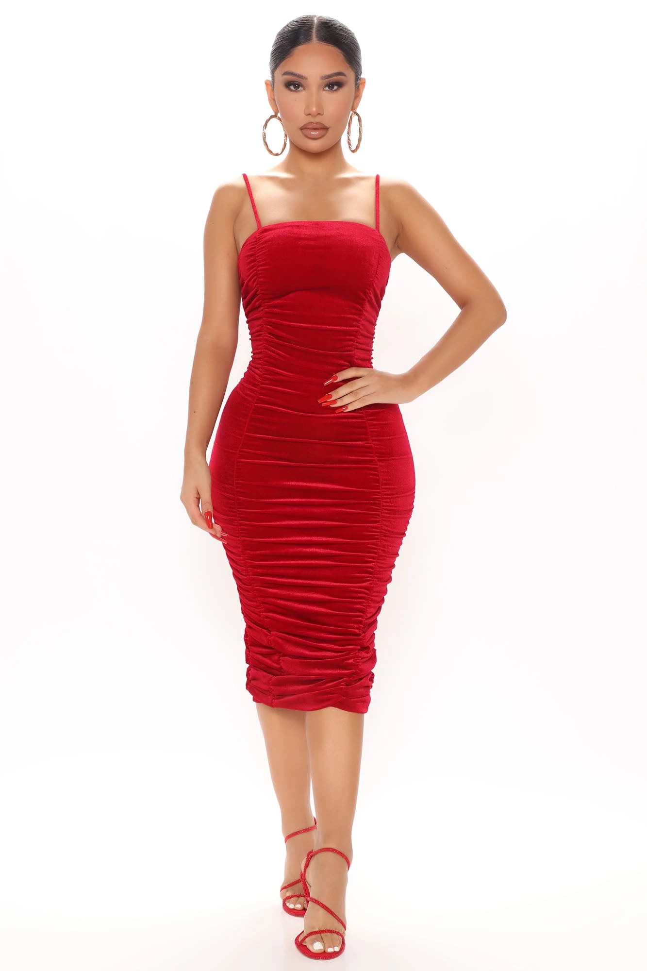 Fashion Nova Smooth Vibe Velvet Ruched Midi Dress – Red