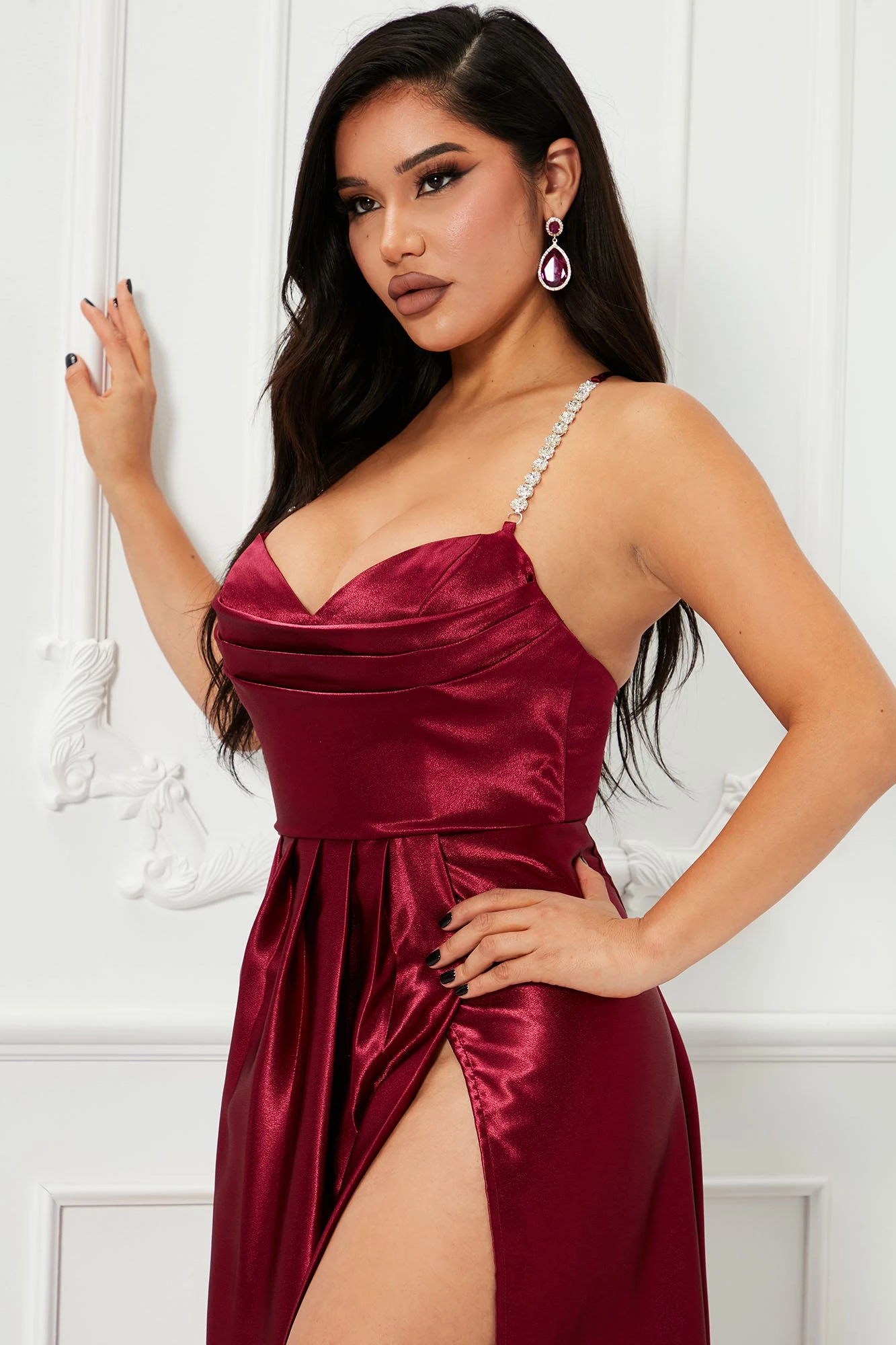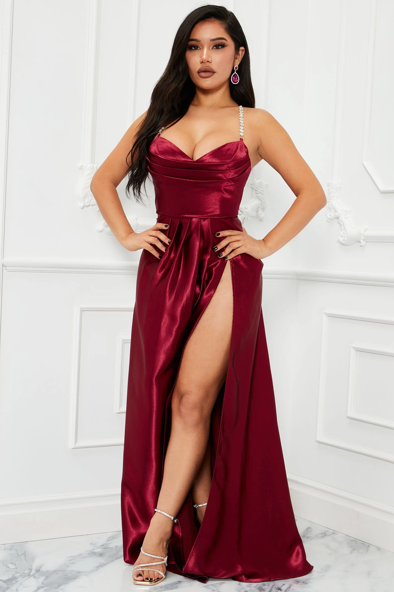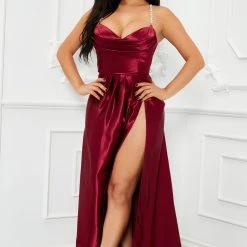 SKU: 6537287663740 Category: Maxi Dresses Tags: All Promo, atticket, color:Wine, ColorFam-Red, detail:High Slit, Dresses, fabric:Satin, fallbogo, length:Maxi