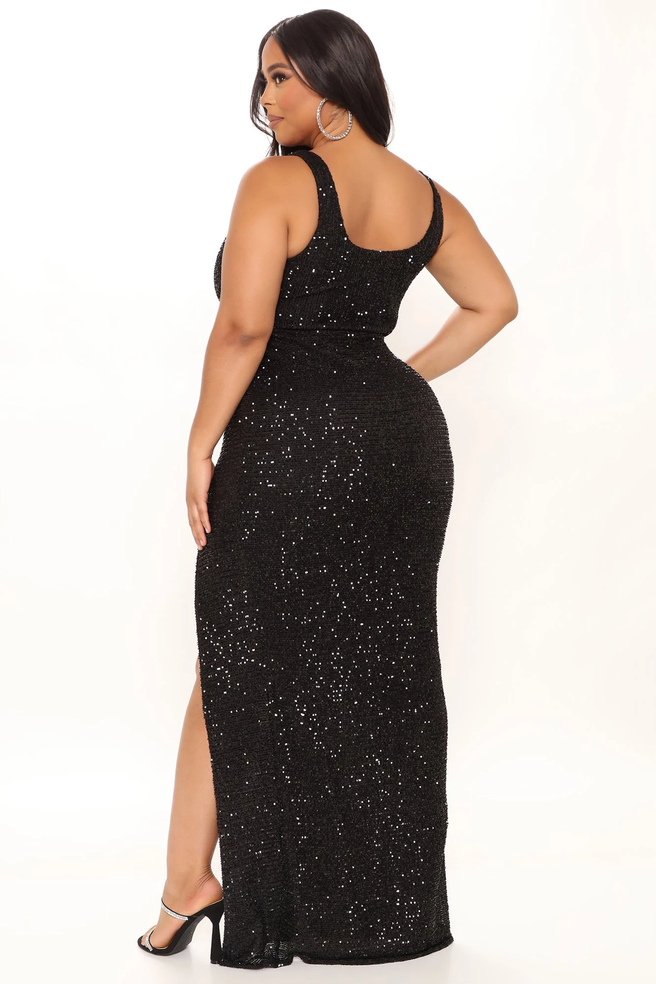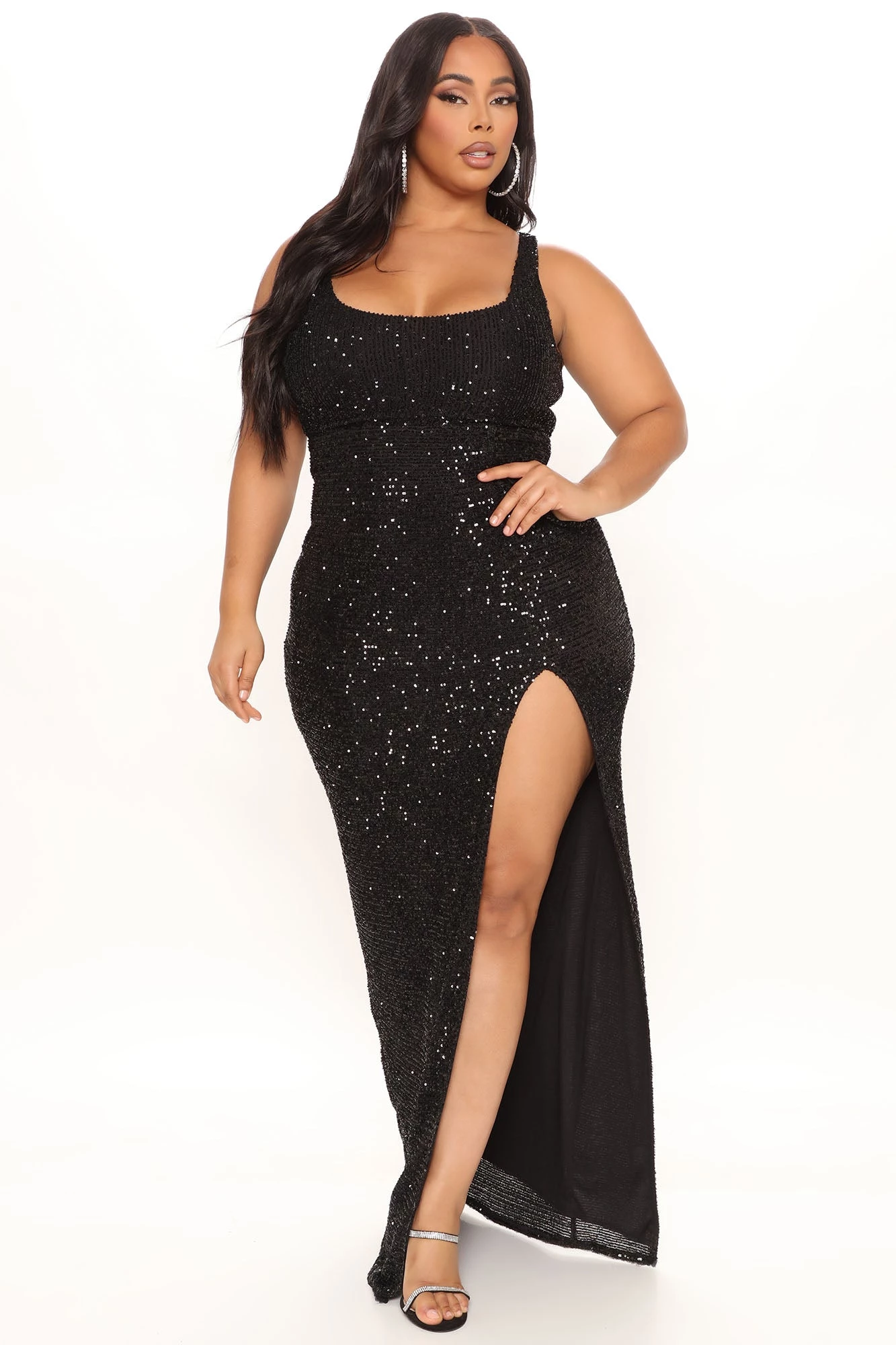 SKU: 1322422927484 Category: Maxi Dresses Tags: All Promo, atticket, color:Black, ColorFam-Black, detail:High Slit, Dresses, fabric:Sequin, fallbogo, figure:Plus