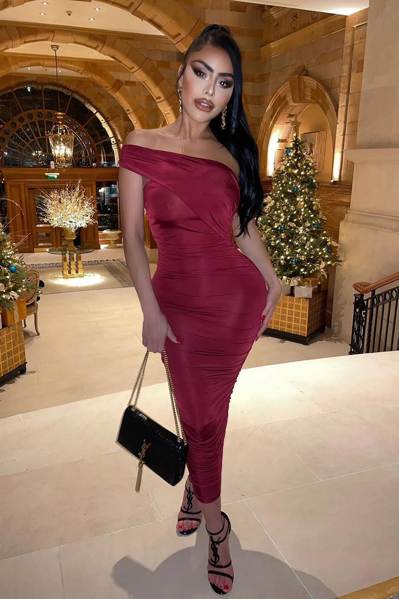 Fashion Nova Tessa Ruched Midi Dress – Burgundy