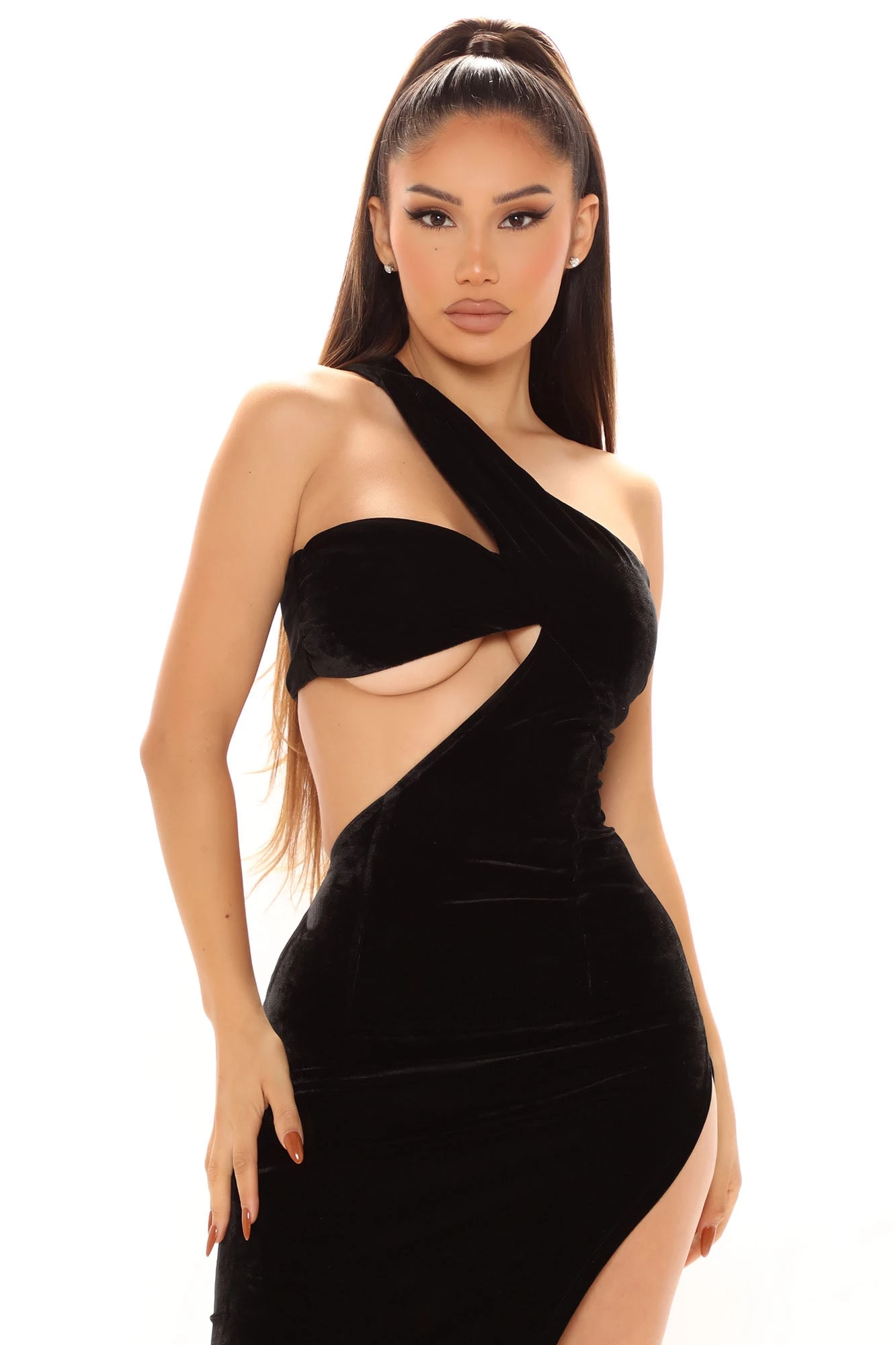 SKU: 6535738163324 Category: Maxi Dresses Tags: All Promo, atticket, color:Black, ColorFam-Black, detail:High Slit, Dresses, fabric:Velvet, fallbogo, FN Exclusive