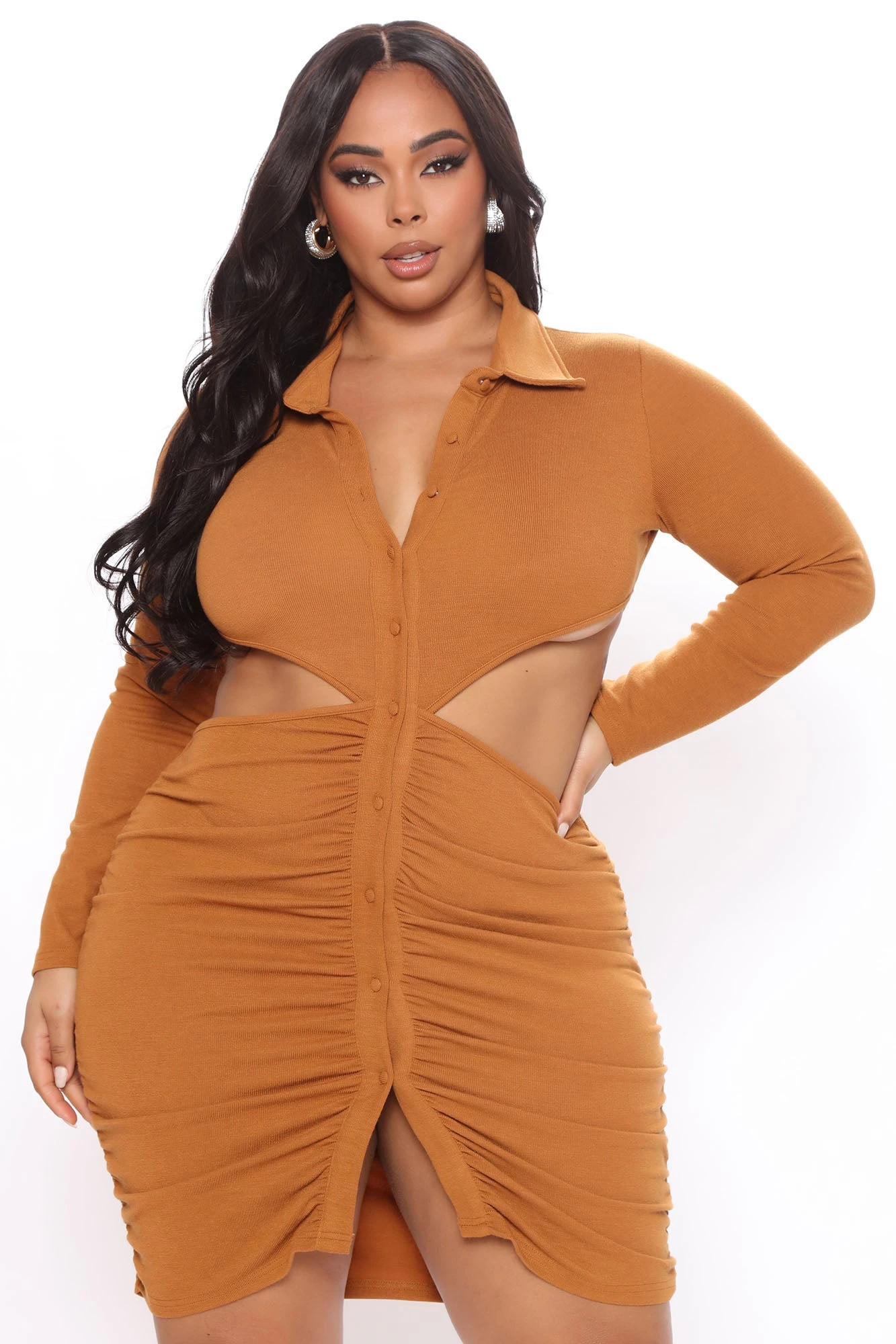 Fashion Nova Well Dressed Ribbed Shirt Dress – Camel